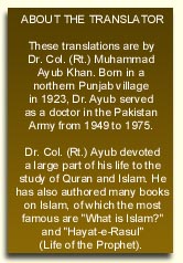 The Urdu and English translations presented in this web site are an improvement in accuracy, understanding, simplicity, flow of language and effect on mind. These translations are by Dr. Col. Muhammad Ayub (see box).
